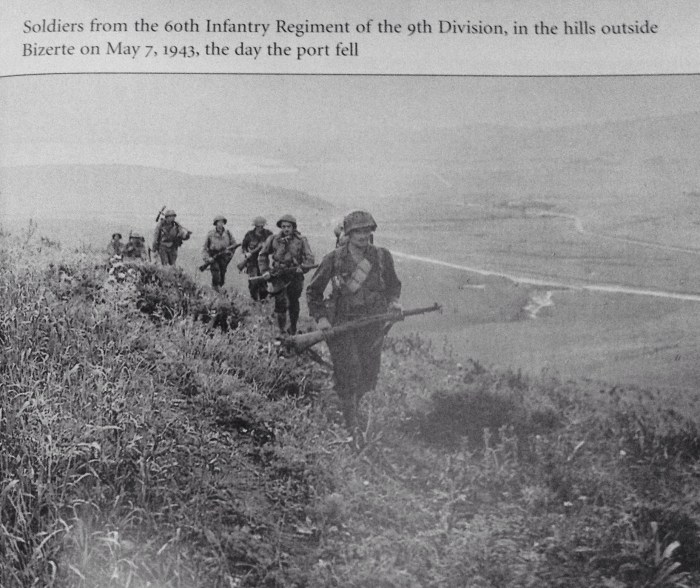 In February of ’43, after relieving the 1st Infantry Division at Kasserine Pass, the 9th Infantry Division spent the next several months in combat across Tunisia. I remember dad telling some stories of those times and the names don’t role across the tongue lightly – Maknassy, Jefna, the Sedjenane Valley, Mateur, Bizerte…. Forgotten names in history books now, but deadly important then. I think the great WWII columnist Ernie Pyle got it right in his description of the Infantry in North Africa: