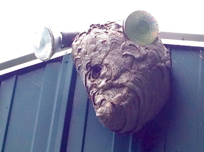 Carmen actually saw them first. Cathy was at the barn cleaning stalls and Carmen was barking like crazy. And kept barking like crazy. That’s usually the sign of a snake, or some other animal that she has cornered or is unsure about. So Cath went outside the barn to see what was causing the commotion. But Carmen wasn’t looking down at the ground, she was looking up. Cathy followed Carmen’s gaze upward, and then she saw it. The wasp nest was at the top of the barn, about 16 feet off the ground, and anchored between two barn lights. Maybe a foot wide, by a foot deep, by a foot and a half high. And while maybe not a freeway, there was county road of wasps flying in and out of the hive.