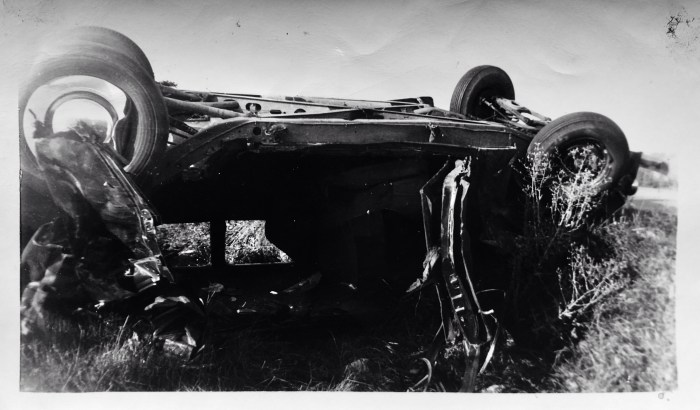 The ride was uneventful to begin with. Then, about half way home someone ran a stop sign on a country road, and T-Boned their car. The impact was violent, and completely flipped the car over onto it’s top . This was, of course, before seatbelts and they were all thrown about, as were their belongings. The four climbed out of the upside down car, and although they were shaken up, miraculously, all appeared to be unhurt. Dad, who would find out later that he had a small fracture in one of his legs, went out to the road to direct traffic around the accident.