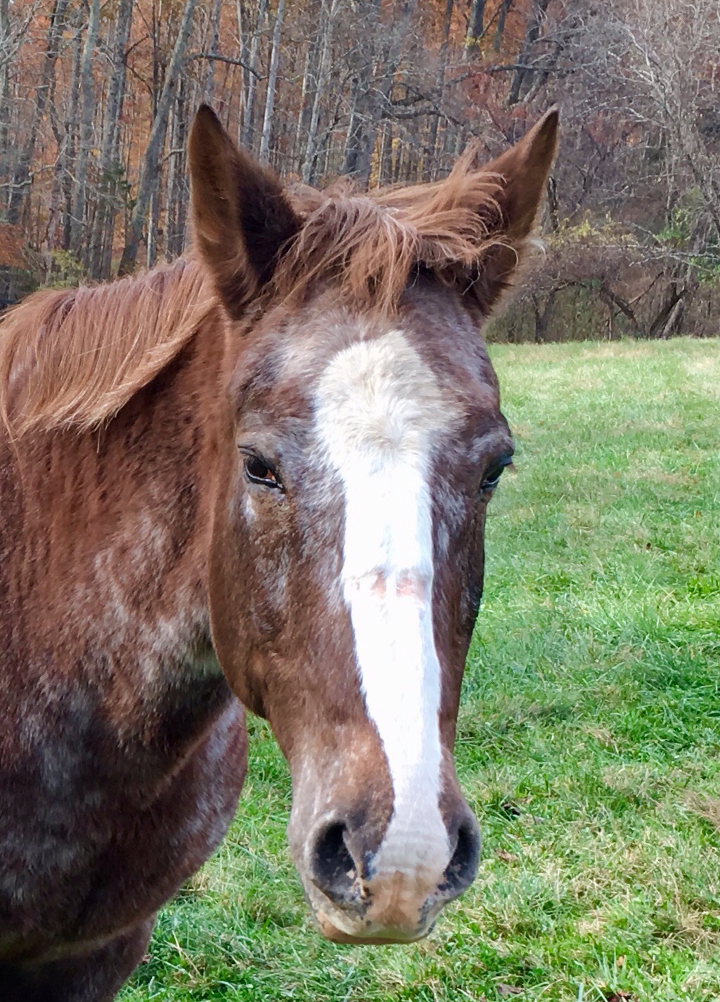 ‘Schendo has been with us for almost 13 years, and is now 26 years old. She’s a sturdy little Appaloosa that Cathy originally purchased in 2005 for dressage. She developed navicular (a bone problem) not long after we bought her, and her riding days were through. Normally, we would have sold her, or given her to someone at that point, but we decided to keep her.