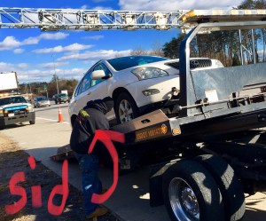 The tow truck, driven by Sid the biker, actually gets there in 1/2 an hour. Sid hooks up the car, shows me a neat trick to get the car to come out of park and go into neutral, and we are on our way to Pohankas.