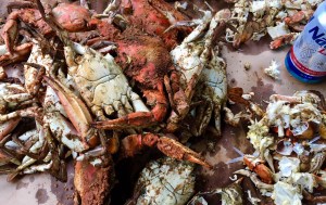 Last night, we gathered at our friend’s home and had a couple of beers while the crabs were steaming. The butcher paper was already on the picnic table. As he finished cooking the crabs, Jim dumped the first load from the pot straight onto the table. While he reloaded the steamer with the back half of the bushel, the rest of us started eating. They were oh so good. The conversation fell off a bit, but it didn’t stop as we were picking. A while later, the second load was also dumped on the table and we soldiered on, although perhaps slowing a bit. Finally, as it neared dusk, we finished up. The tables were cleaned and we adjourned to the porch for another drink or two and more conversation.