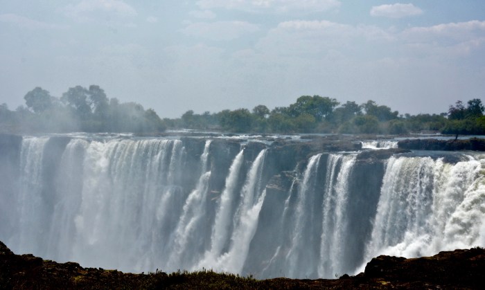Walking along the trail opposite Victoria Falls, it’s easy to see why they call it “The Smoke that Thunders.” You can hear the Falls rumbling when you are in town, which is over a kilometer away. The smoke? The huge amount of mist that is generated by the Falls pouring into the chasm below.