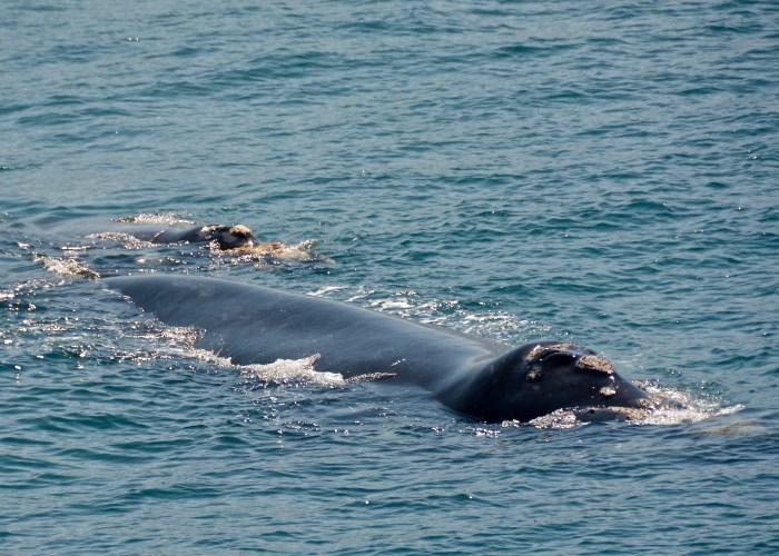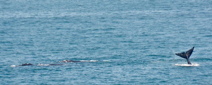 The following day was even better. In the morning as we watched from Gearing’s Point, four whales with their calves paraded past where we were standing on the cliffs. They are huge animals – I’m guessing the mothers were over forty feet long. They took their time, before finally moving on.