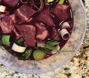 This particular recipe is for a Three Day Beef Daube. It’s from a book my old friend Tim lent me called “Duck Season”. The book is about the Gascony region of France, and if you enjoy reading about other countries, particularly their food, drink and culture, I highly recommend it. The dish takes three days to make, although the steps are pretty easy. Day one – marinate the beef; day two – make and cook the daube for 2-3 hours and let it rest over night; and day three – gently simmer the daube for a couple of hours and then eat. That’s all there is to it.