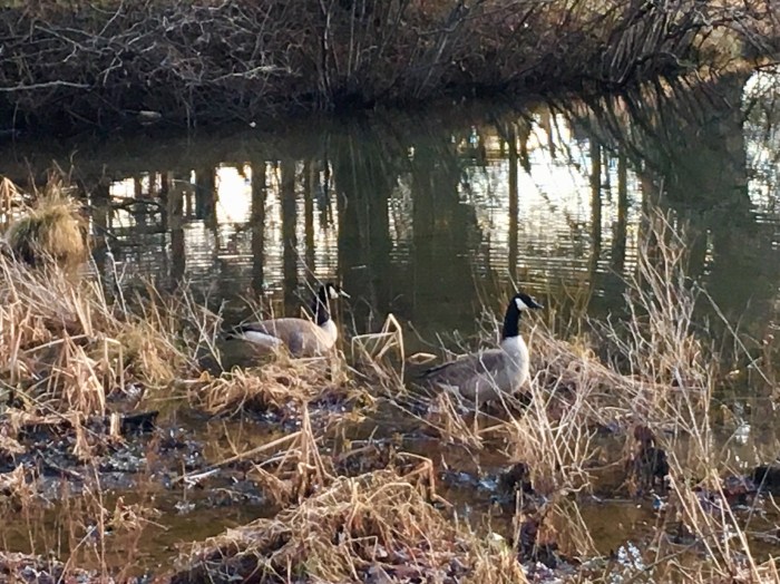 Right now, there are two geese on the pond. In addition to swimming and floating around, they are in the nearby field eating grass or grain. Somewhere around here, they have a private home that is out of sight. And there, they will have goslings before long. In the next couple of months (probably April), I will see mom, followed by 4-6 goslings, followed by dad, walking into the pond.