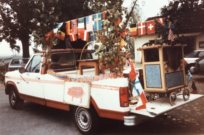 In January of ‘88, Wolfgang and Adolf approached me one evening at Sportheim. They had an idea for the town’s Fasching parade that year, and wanted to see if I could help. They planned to enter a joint float in the parade, with Wolfgang and Vroni handing out beers, while Adolf would hand out small wursts (sausages). I thought they were going to ask me to help hand out beers, but they had something else in mind – would I drive my Ford F-150 Pickup in the parade, while they handed out the goodies from the back of the truck? Are you kidding!?!?? This was a no-brainer, and I immediately said yes.