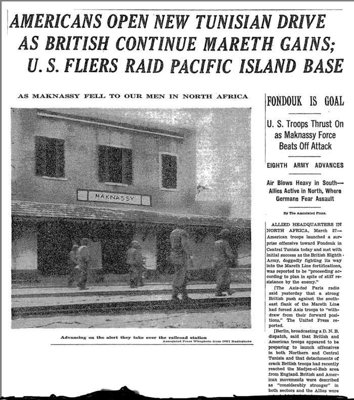 The Germans retaliated with heavy shelling. Undaunted, the 60th moved and attacked again a day later, entering the town of Maknassy itself on the morning of the 22d. The Germans left sometime during the night, and the 60th entered without firing a shot. The New York Times headline back home featured a picture of the unit entering the town near the Railway Station. The easy part was over.