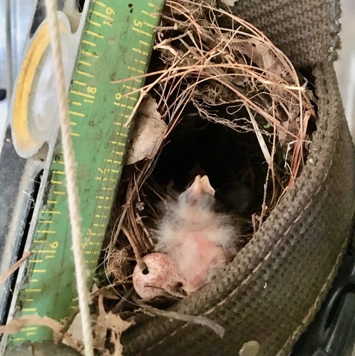 I think the odds are stacked against this baby bird, but maybe not. His mom picked a poor location for the nest. It’s in our garage, in the center of a tool belt hanging on the wall. I think it just hatched today, maybe in the last couple of hours. Mom flew off when I went into the garage, and that’s how I found the nest.