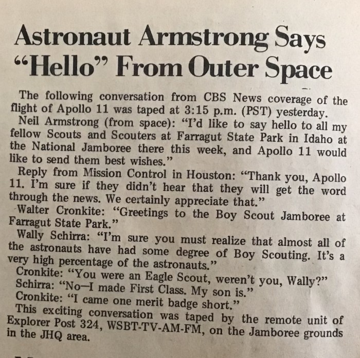 On July 18, while flying toward the moon, Armstrong greeted us Scouts via Radio: “I’d like to say hello to all my fellow Scouts and Scouters at Farragut State Park in Idaho having a National Jamboree there this week and Apollo’s 11 would like to send them best wishes.” We couldn’t believe it when we heard about the broadcast. Here he was, going to the moon, and he took time to reach out to us. The transcript of the broadcast made our Jamboree newspaper the next day.