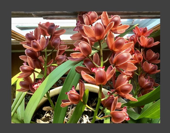 If you ask Cath how she grows such great orchids, she’ll answer “Oh, I just water them. Otherwise, it’s tough love. They go outside in the summer, come back in for the winter, and are never fed orchid food”.