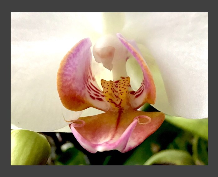 I love to look at and consider just one individual flower. They are intimate in their own way. The color, the texture, the patterns, the beauty of the flower and all of it’s individual parts – Sepals, Petals, Lip, and Column, make each orchid unique.