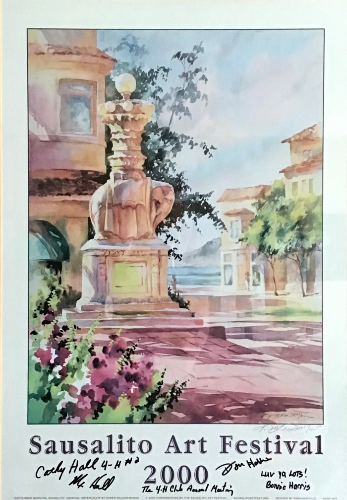 On Saturday, after a big breakfast, we walked about a mile to the Sausalito Art Festival. The Festival was held every year on Labor Day Weekend at the waterfront and was quite the event. Art of all kinds was on display and for sale. There were a number of bands playing throughout the day, and they had wonderful food and drink to keep you sated. It was our kind of place. We started the day wandering through the displays, listening to the music and drinking champagne. Cathy and I bought a print of two tulips, and Don and Bonnie bought a painting of two chairs facing a lake. He called the painting “Retirement”. I snuck off and bought Cathy a pair of earrings for Christmas at one point. The weather turned warmer, and the boys switched to beer, while the girls stayed with champagne. We eventually settled in front of one of the stages and had some food while listening to a band. We christened ourselves the 4-H Club, and later, bought a poster to commemorate the day. It was a great way to spend a Saturday afternoon.