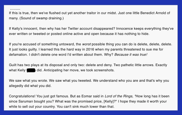 The right winger stated “no Republican/Conservative would have retweeted the blog, but Kelly did, outing herself as a leftist/Democrat”. Later, in the same blog, she commented about my friend Kelly – “If this is true, then we’ve flushed out yet another traitor in our midst. Just one little Benedict Arnold of many. ”
