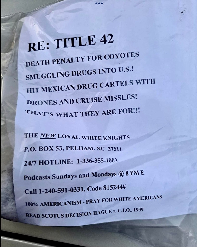 It’s interesting to note the reference to the SCOTUS decision in the photo. In Hague v. Committee for Industrial Organization, (1939), the Supreme Court ruled that banning a group of citizens from holding political meetings in a public place violated the group’s freedom to assemble under the First Amendment. Of course these losers aren’t holding any political meeting in a public place. They are just littering our beautiful Fauquier countryside with bigoted and racist white supremacist garbage, all masked under the cover of darkness.