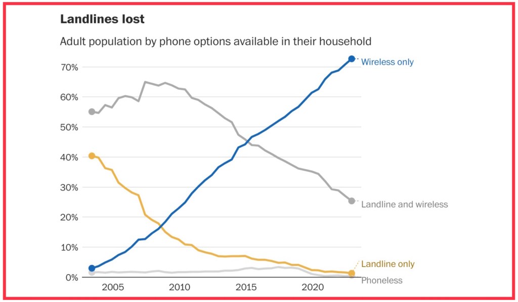 Frequent moving causes major changes in electronics ownership and types of connectivity. When we moved to Denver from Cincinatti in 2006, we shifted from a hardwired landline (analog) to a set of digital wireless phones tied to a landline. I remember worrying about not having an analog phone for emergencies (harkening to my Signal Corps training) – but it never became an issue. Then in 2013 we moved to Switzerland, and having to abandon nearly all American electronics, and much more, going from a 4500 sq ft house to a 1200 sq ft apartment, and experimenting if cell-phone only was viable. And it was during our 10 year Switzerland adventure. Now back in Dallas a year ago, never gave the landline a thought – knowing that even the telco’s are discouraging them. I’ll keep a close watch on those risky behaviors, as a precaution 🙂 My doctor and dentist already use half a dozen ways to nag us of upcoming appointements, relentlessly – who needs a seventh?