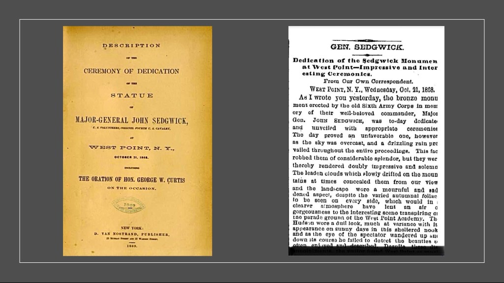 The men of VI Corps liked him and affectionately referred to him as “Uncle John”. As the war ended, the officers and soldiers of the VI Corps took up a collection to build a statue of their fallen leader. Confederate cannon, captured by the Corps during the Civil War, were recast into the statue of Sedgwick and the dedication ceremony was held at West Point on October 21st, 1868. According to New York Times coverage of the event, it was a rainy day but many luminaires were in attendance, including General George McClellan. It was only the second statue erected at the Academy at the time.