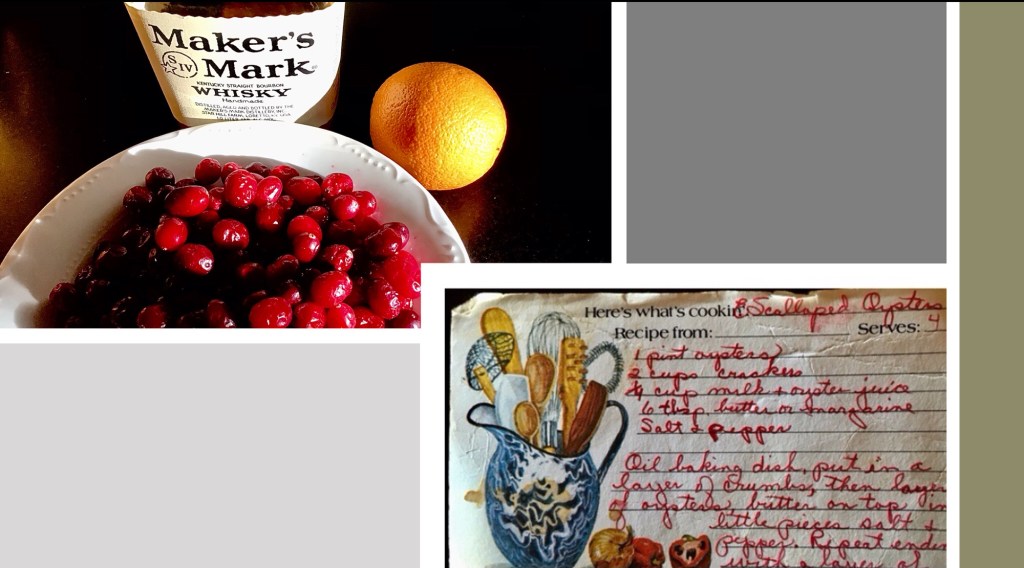 For the past several years, it was more likely we travelled (again) or went to someone else’s home for the big feast. We always brought either Mom’s Oyster Dressing*** or Dad’s Cranberry Sauce**** as our complement to the meal. Going to someone else’s home always meant less work, but it also meant no turkey sandwiches the day after.