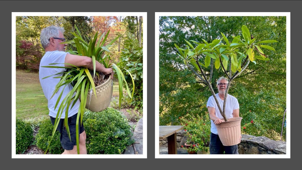 Each October at Rohan Farm, we have a sign of cold weather’s impending arrival – the day Cathy plays god with the outdoor plants. Which ones come in the house, which are on life support in the barn tack room, which are left dormant in the garage, and which ones die on the patio with the the first frost.