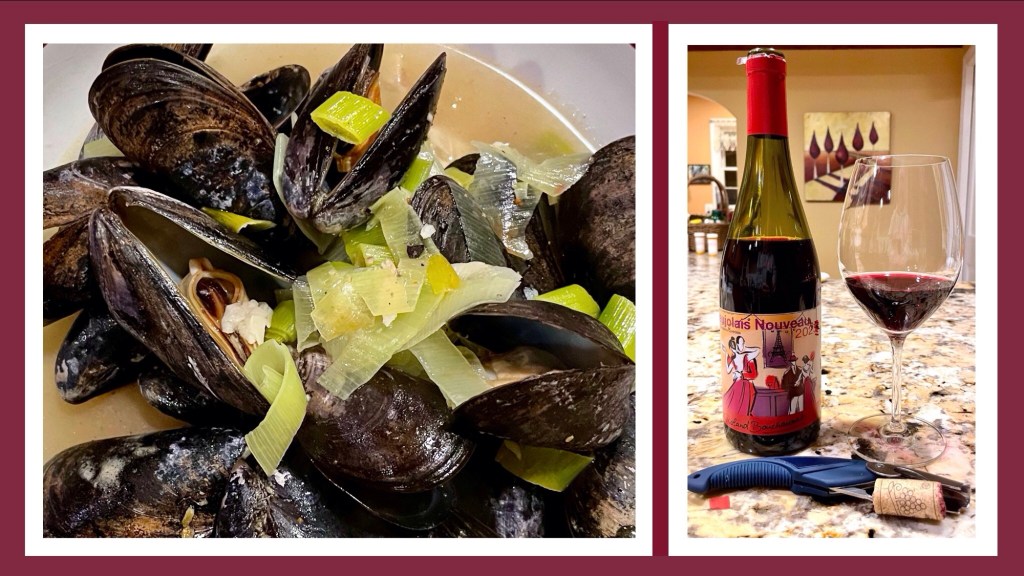 - Personally, I think mussels are a natural pairing with Beaujolais Nouveau. You can find recipes for both mussels and white wine, or mussels Pastis online. Many simple dishes would work. A Steak Frites, would be great.