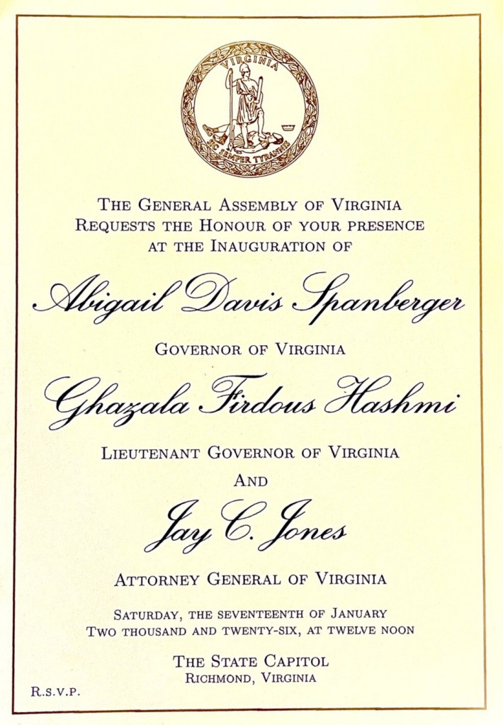 This Saturday, Cath and I will be in Richmond, Virginia with friends attending the gubernatorial inauguration of Abigail Spanberger. We are excited and are looking forward to the event. As a bonus, she will be our first female governor.