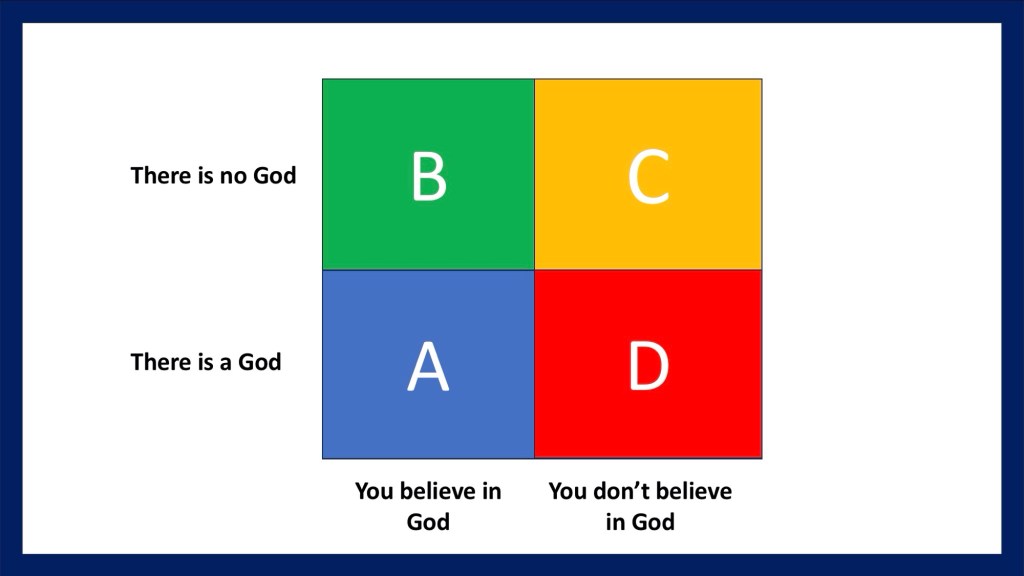 1. Of course, the problem of choosing to “believe” in God because of this matrix and the wager on a better outcome is not real belief – and thus does you no good with the God who really is there. His requirement is real faith and devotion.