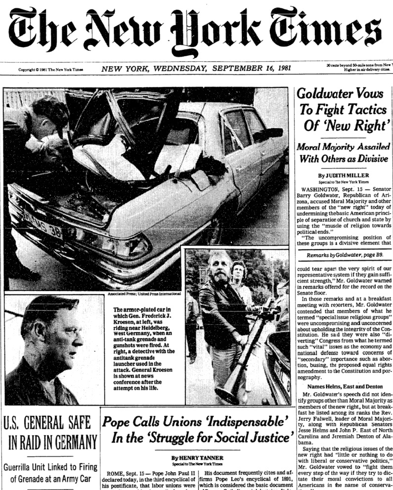 Things were a bit tense in West Germany that Fall. In August, a large car-bomb exploded at Ramstein Airbase, wounding twenty people. Responsibility for the bombing was claimed by the Red Army Faction, also known as the Baader Meinhof gang. In a letter, they declared “we have undertaken a war against imperialist war.” On September 14th, there were violent protests in Berlin, coinciding with a visit by Secretary of State Al Haig. Over 50,000 people took part in the protest. Two days later, on September 16th, the Baader Meinhof gang struck again with an assassination attempt on General Frederick Kroesen, the commander of all United States Army forces in Europe. Using a Soviet made grenade launcher, they severely damaged his car, but the General and his wife were unharmed.