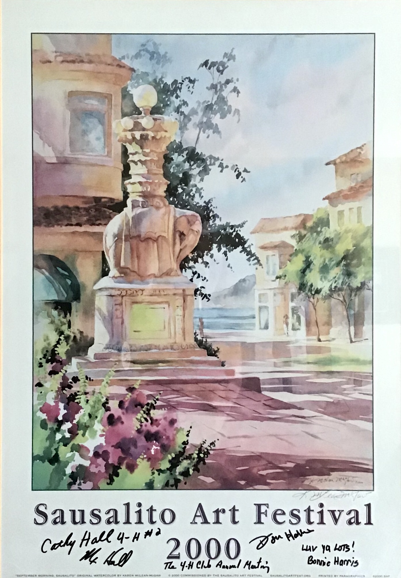 On Saturday, after a big breakfast, we walked about a mile to the Sausalito Art Festival. The Festival was held every year on Labor Day Weekend at the waterfront and was quite the event. Art of all kinds was on display and for sale. There were a number of bands playing throughout the day, and they had wonderful food and drink to keep you sated. It was our kind of place. We started the day wandering through the displays, listening to the music and drinking champagne. Cathy and I bought a print of two tulips, and Don and Bonnie bought a painting of two chairs facing a lake. He called the painting “Retirement”. I snuck off and bought Cathy a pair of earrings for Christmas at one point. The weather turned warmer, and the boys switched to beer, while the girls stayed with champagne. We eventually settled in front of one of the stages and had some food while listening to a band. We christened ourselves the 4-H Club, and later, bought a poster to commemorate the day. It was a great way to spend a Saturday afternoon.