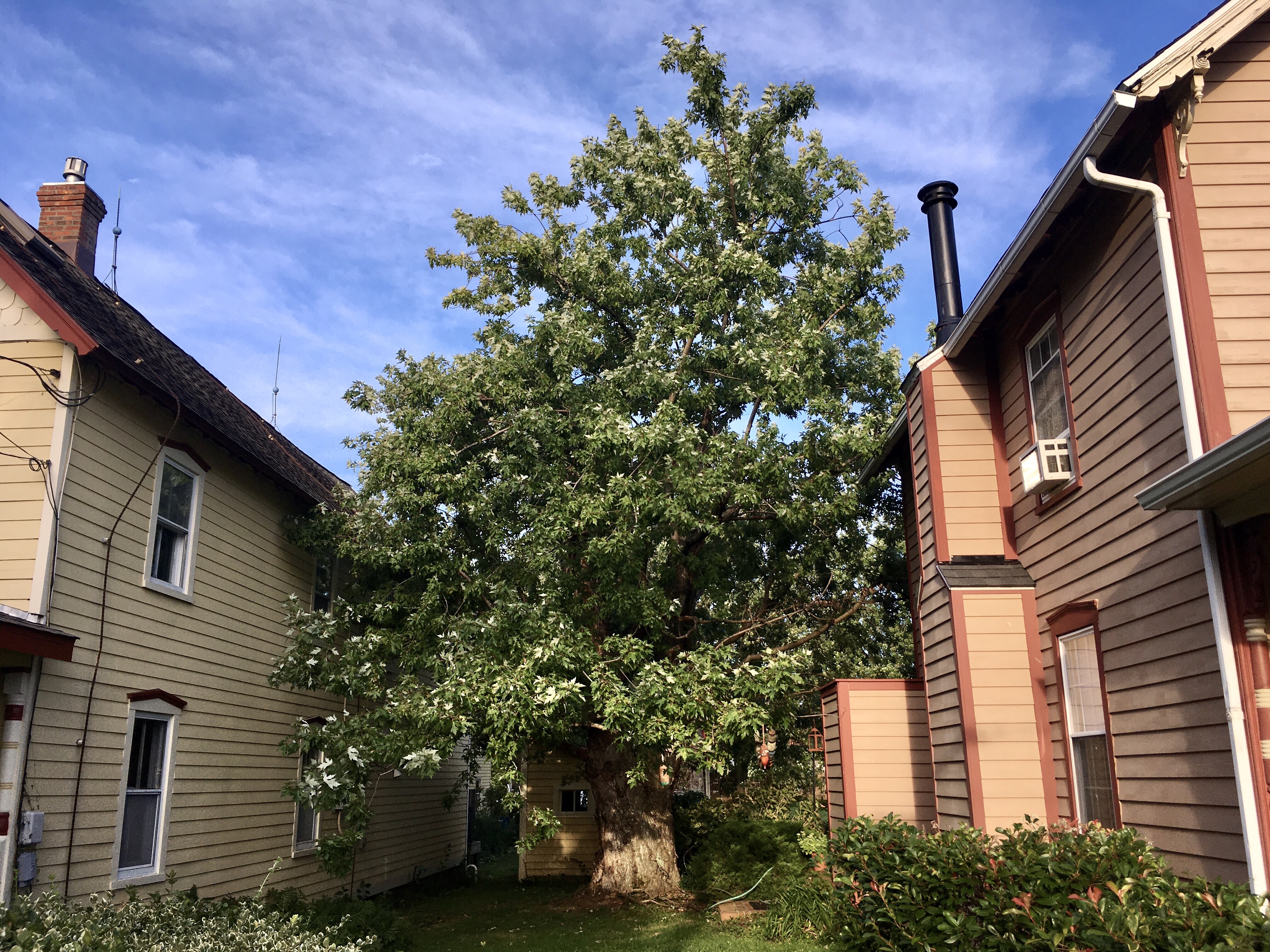 While not exact, the method is a good approximation. Interestingly, another method I used (measuring a foot off the ground) came up with almost exactly the same age. Perhaps the tree isn’t 130 years old, but I have to believe it’s at least 108. Vinnie’s house was built in 1912. No one would plant the tree right between the two homes, fourteen feet from our house, and eleven feet from Vinnie’s. No one.