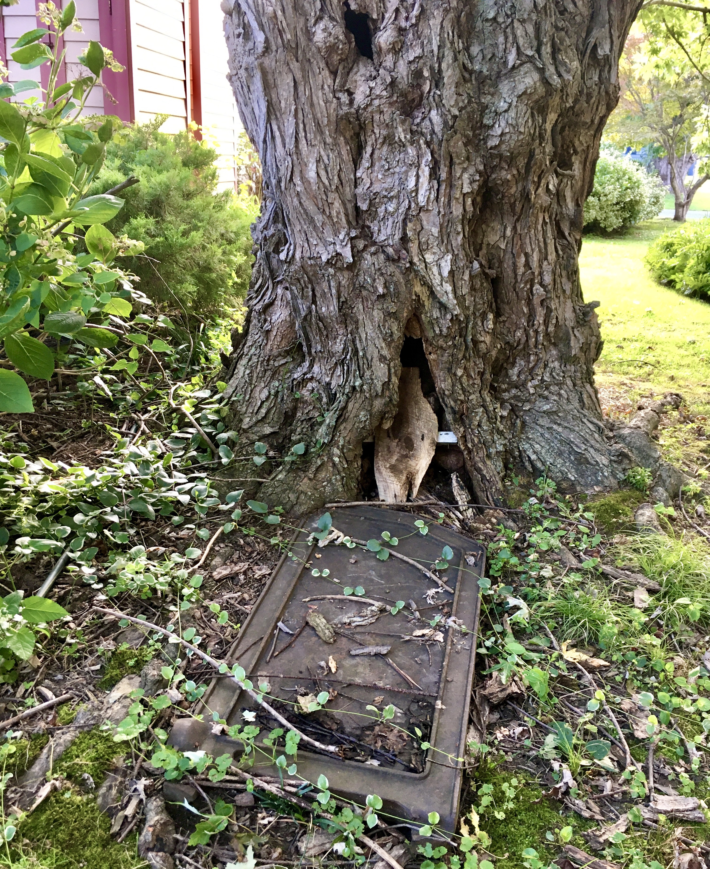 Now, it’s hoary and contorted, and probably doesn’t have many years left. A Silver Maple at 130 years of age is considered quite old. A storm, or lightning, broke the top two main trunks off the tree sometime in the past, so it’s not as tall as it once was. Instead, it has that knobby, twisted, slightly wizened look that old trees, and some old people develop. A bit of a Halloween look, if you will. There’s also a metal “door” of sorts embedded at the base of the tree. I’ve tried to lift it, or move it, but it won’t budge. At some point in time, I fully expect Christopher Walken, as The Headless Horseman, to emerge through the door.