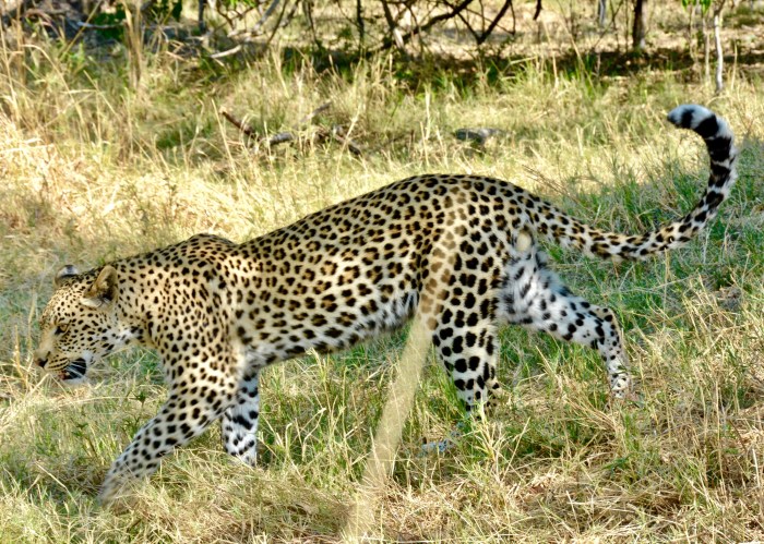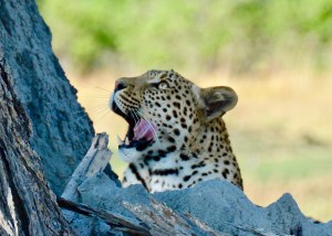 There were only ten of us in camp that night. Our six, an Italian couple, and a French/Belgique couple. As a special treat, the dinner table was set up al fresco under the stars with candles and candelabras. The food and drink were excellent as always. GT’s before dinner, a Chenin Blanc with our first course, and a Shiraz/Cab blend with dinner. Later, when it was time to go to bed, our escort guided us to our tent. In this case, we were on an elevated walkway. We suddenly heard noise below us and our guide shined his light under the walkway. Huge Cape Buffalo were laying down and settling in for the night. Their heads and horns were maybe five feet below us.