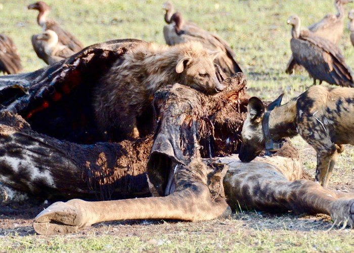 The last morning, we came across a pride of hyenas with an antelope kill that our guide thought they’d taken from a pack of painted dogs. There were probably about 12 hyenas including some young pups. We watched them eat, and then noticed that the matriarch was limping. She was favoring her right front leg. Did something happen in the confrontation with the dogs? We didn’t know, but perhaps it was broken, or otherwise hurt. If it doesn’t heal quickly, she probably wouldn’t last, and another hyena will take over the pride. It only takes one mistake.