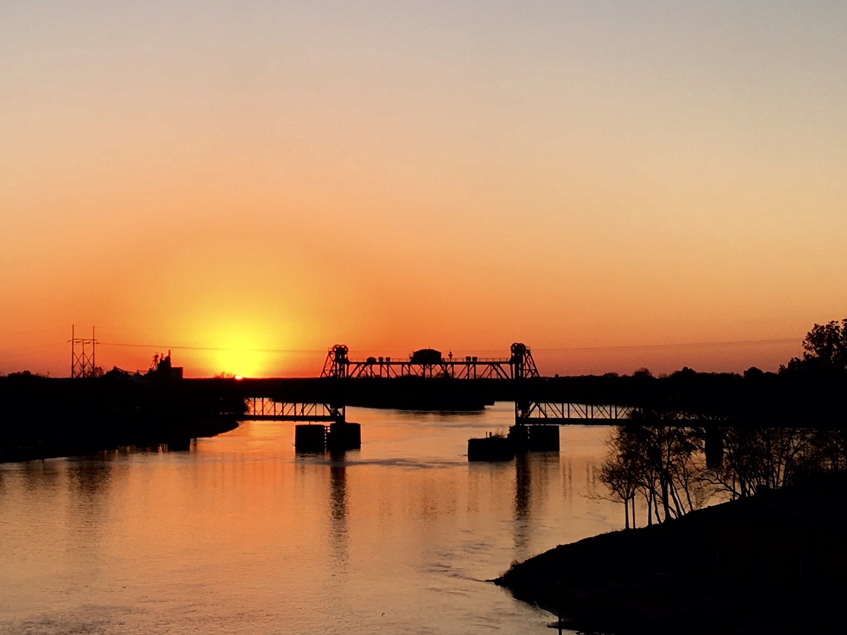 It turned out my dad knew the bridge tender, Wally Halm. They both played local baseball, and were in the VFW together. Mom and dad climbed the narrow stairs up into the hut and once there, they watched the sun set, which seemed extra pretty that night. A few minutes later, Wally received a call from a barge on the river. He needed to raise the center section, so the barge could pass underneath. (Back then, there were several trains a day using the bridge, so it normally stayed in the down position. Today, there are only a couple of trains a day, and lots more barge traffic, so the center section stays up, and only lowers when a train comes).