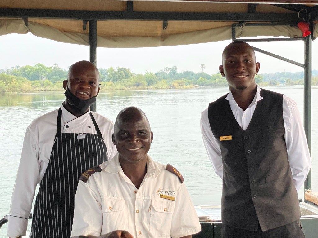 We arrived at our boat, The Victoria, around 4:15PM and were greeted by the boat’s bartender Trymore, with their version of a Pimm’s Cup. The boat pushed away and for the next two and a half hours, we cruised the Zambezi. Due to covid, the four of us were the only guests and we were treated quite well. The boat had a three person crew -Trymore, PK the chef, and our Captain, Misheck.