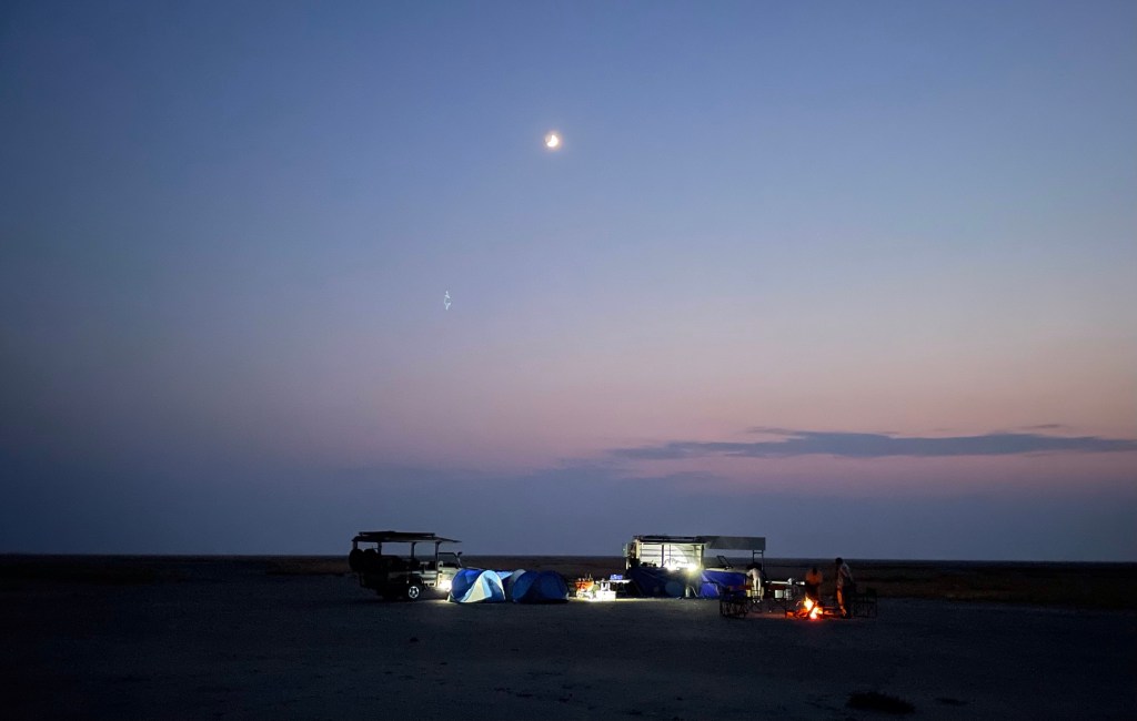 We connected with Maipa and Mash who drove “The Elephant” (a vehicle with the kitchen equipment, lights, tarps, loo, etc) to the Pan earlier in the day. It was they who set up the kitchen, and the dining area. You could already smell good things cooking on the fire and stove for our dinner. We were served sundowners, and then received a safety talk and a briefing on how to use the loo.