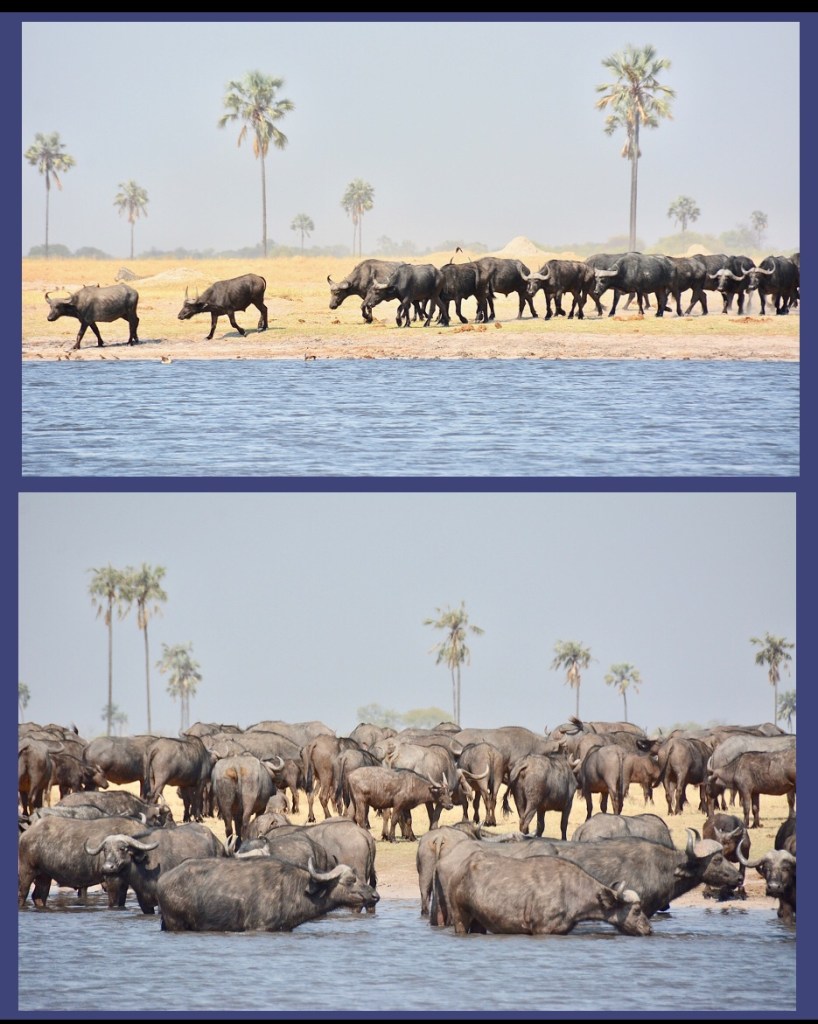 On another day in the morning, Sean drove us over an hour to the pan (water hole) called Mbiza, where we sat and waited to see what might appear. There were baboons, zebras, and warthogs, some ostrich in the distance and many beautiful birds. While sitting there, all of a sudden a dark line appeared on the horizon. It then became a dark line with dust in the air over it. A large herd of Cape Buffalo was approaching. We watched for fifteen minutes as they slowly made their way to the pan. They were in no hurry, and it was more of a march. Finally they arrived and crowded the bank of the pan on the opposite side from where we sat. We were perhaps 40 yards away from the massive herd. Sean said there were over 600 of them. When we asked how he knew how many there were, he answered straight faced “Oh it’s easy. I just count the legs and divide by four.” We all burst out laughing.