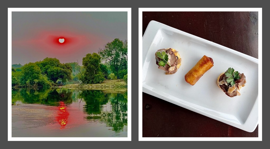 Both the river and time drifted along. It had been overcast, so we didn’t hold much hope out for a great sunset. Suddenly there was a shift of clouds in the west and the sun appeared above the horizon. We watched for several minutes, mesmerized by the colors of the sun playing across the sky and water. It was one of those moments where time froze in place. As we finally returned to our seats, the fourth and final course, “Mini beef Wellingtons” arrived, along with some red wine.