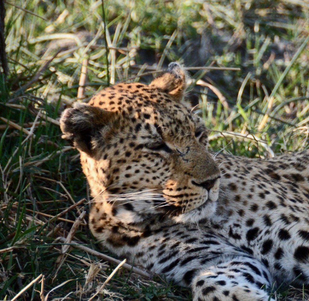Later on that first day, we had an unbelievable leopard sighting. Harry, our guide had seen the leopard the day before at the site of a kill, so he knew roughly where it would be. Still, this was amazing. After tracking the animal, he located it dozing near a tree. You or I would have gone right by and never known it was there. We were only about five yards away, and watched the leopard for about fifteen minutes as it dozed, woke briefly, and then dozed some more.