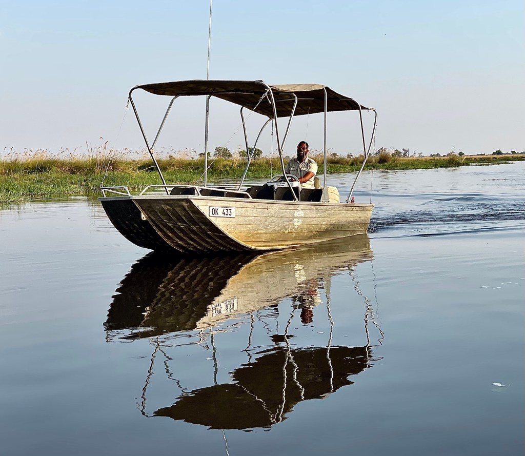 It was after the Little Bittern sighting when we saw the fast approaching boat. Although Harry didn’t look concerned, the four of us had unspoken questions. What the hell was going on? Why would someone be coming down the channel that rapidly? Was there a problem somewhere? Had someone else’s boat been upended by a hippo? Were they going to warn of us about an issue up river? Was there some exciting sighting further up the river? We then recognized Mox, the lodge manager, and Harry said “Mox has a delivery for me.”, which raised more unspoken questions – What was so important that a delivery was needed in the middle of the Khwai River during our safari? Were we low on gas? Was oil leaking? Was there an unknown engine problem? Mox gave a wave, smiled and slowed down as he approached our boat.