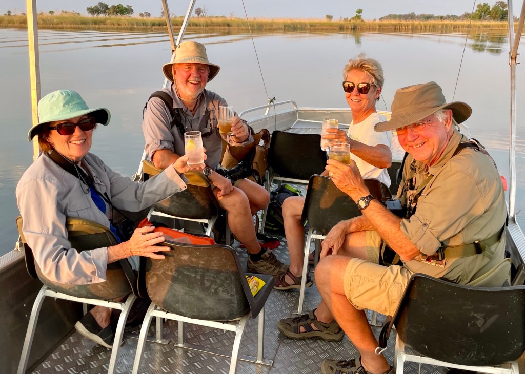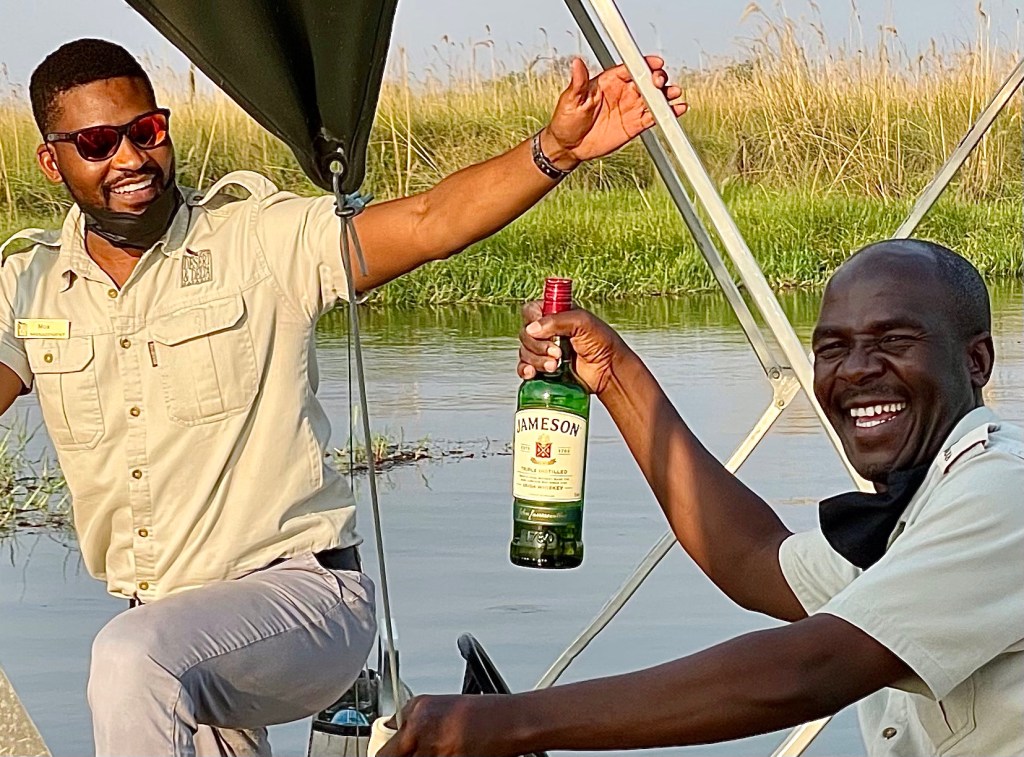 Mox pulled up next to us and then all became apparent – he handed a bottle of Jameson Irish Whiskey to Harry! Harry and Mox both started to laugh, and then let us in on the rest of the story. When we left Xakanaxa that afternoon, Harry packed Gin, Tonic Waters and limes for our sundowners, but forgot to grab the Bottle of Jameson. Our friend Bill had switched between G&Ts and Jameson over the course of our trip, and Harry wanted to be prepared for either choice, so he radioed back to camp to have the Jameson delivered to our boat. At that, we all broke out laughing. This was service above and beyond the call of duty. With a wave and a smile, Mox departed and went back to camp.
