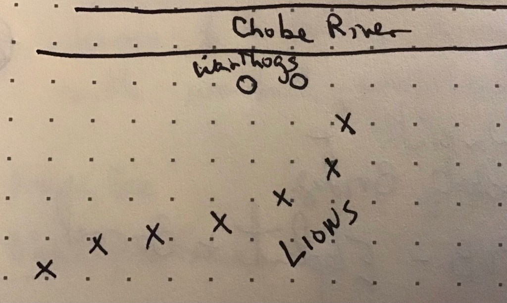 As the matriarch proceeded towards the warthogs, she occasionally slowed or stopped, or shrunk down to the ground. The rest of the lions followed her lead and acted similarly. While she moved on a straight line to the warthogs, the rest of the pride slowly spread to the left as they crossed the stream. With the River on the far side preventing the warthogs movement in that direction, the lions spread in a lazy “L” to the left, creating something of a classic ambush setup. The warthogs were blocked in on three sides and oblivious to what was about to happen. We were barely breathing as we watched the lions set up the attack.