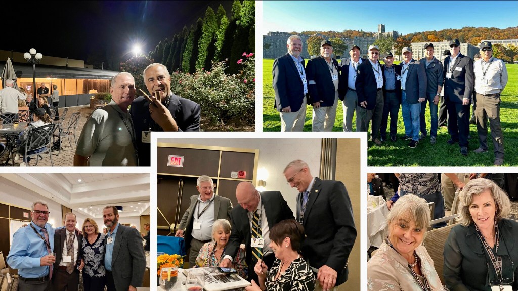 By Thursday night, things were in full swing. Around 300 classmates (about one third of our living class members) along with 250+ spouses, partners and family members were there. Dinner, drinks, and for some of us, cigars ensued. My time was divided between dinner with several of my company mates and then circling the rooms seeking out other old friends. Handshakes, hugs and toasts, along with conversations occurred several times – How are you? … Where’s Cathy – is she OK? … Do you remember … whatever happened to … where are you now … we have to do better at staying in touch … Eventually I made my way to bed and a restless night’s sleep.