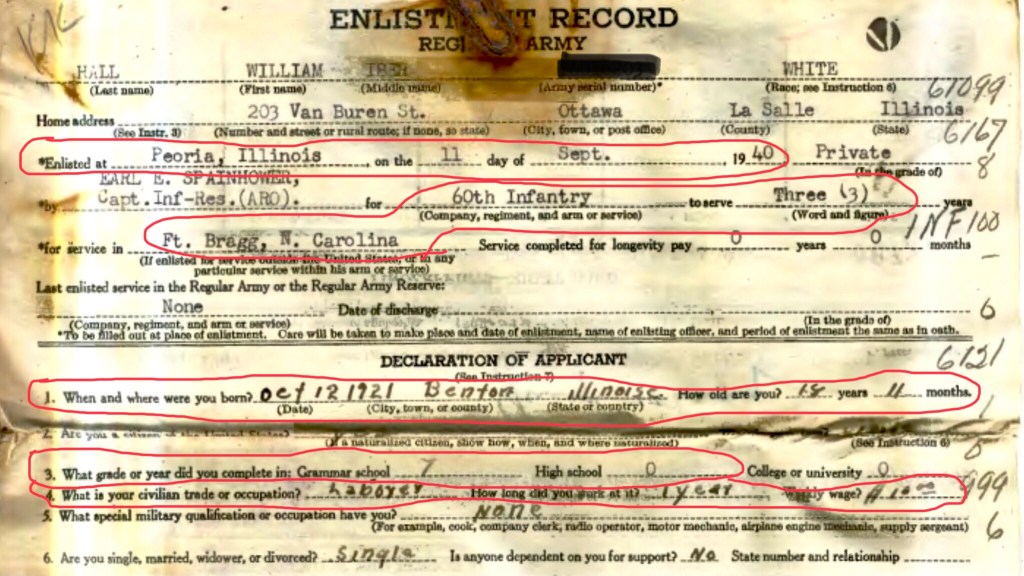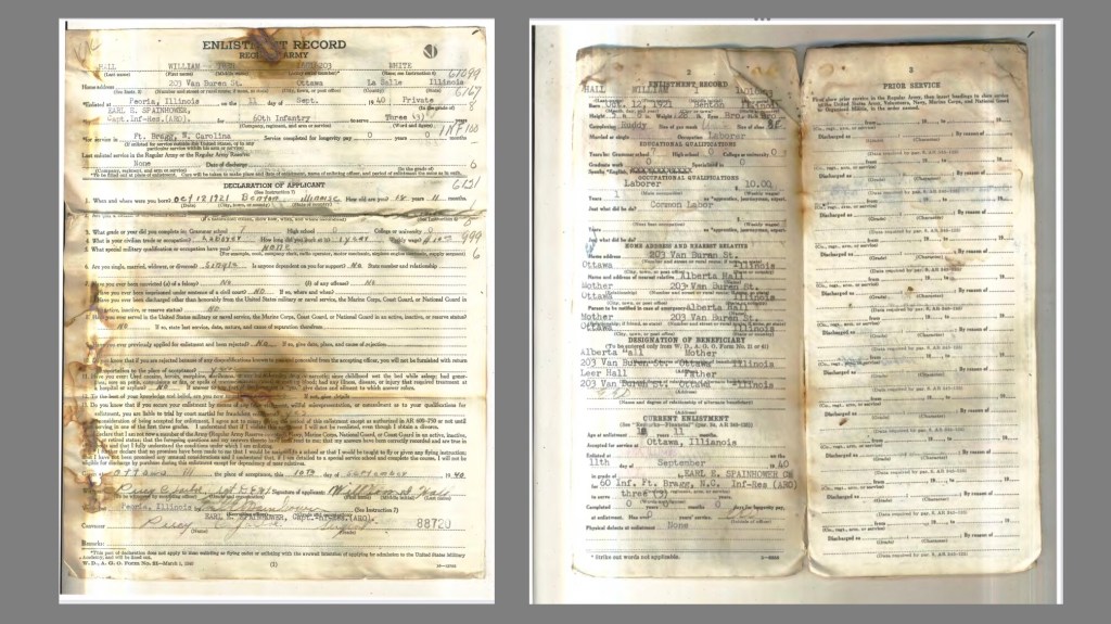 We’d always been told that dad enlisted in 1940, and knew he had to have lied about his age. My Aunt Ellen, his older sister by several years, went to the recruiting station with him to verify his age to the recruiter. Life at that point in time, at the tail end of the depression was tough, or at least tough for the Hall family. Grandma was supporting the family with her work, and Grandpa was only a part time presence at home. There was no money, and probably not many jobs, at least not for a 16 year old. The pay in the Army was $21/month at the time, plus food and housing. I think it looked pretty good to someone who had a fairly rough life to that point.