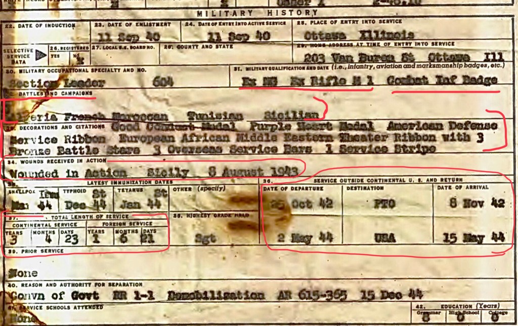 When discharged from the Army on August 24th, 1945, dad was 21 years old and had been in for nearly five years. His WWII service included time in Algeria, Tunisia, French Morocco and lastly, Sicily, where he was wounded. His discharge papers tell the intriguing story of those five years in one page.