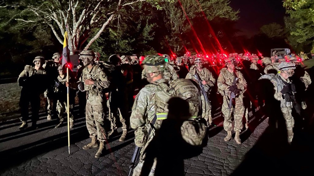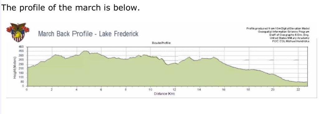 Soon, the buses arrived. We left a little after 0200 and drove to Lake Frederick. After a quick breakfast, they started linking us Old Grads with the companies and platoons we would each march with. I and several others would walk with G-4, the 4th platoon of Gulf Company and they linked us with them around 0415. We grads were only carrying small Camelbak packs with water and maybe a snack, bandaids and a pair of dry socks. The New Cadets? Full uniforms, helmets, 30-40 pound ruck sacks and their M4 rifles. Yep, men and women alike, they were doing a full combat march back to the Academy to start the academic phase of their Plebe year.