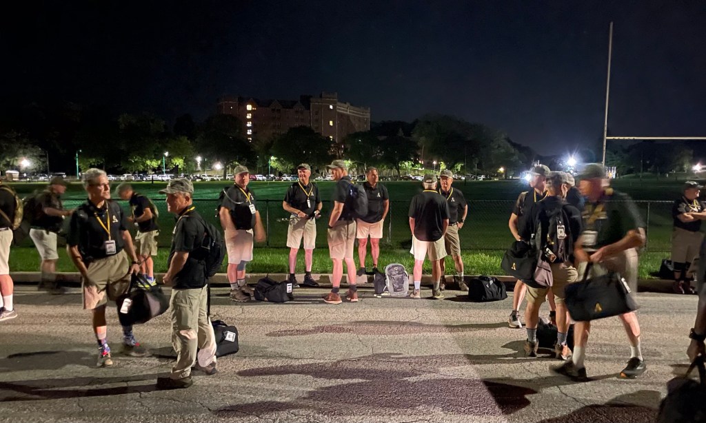 We started gathering around 0130 at Buffalo Soldier Field. Soon, buses would drive us to Lake Frederick. There we would link up with the West Point Class of 2028 and join them for their 14-mile March Back to West Point, which culminates with the end of New Cadet Summer Training, aka Beast Barracks. The Class of ‘28 will graduate exactly 50 years after we graduated in ‘78.
