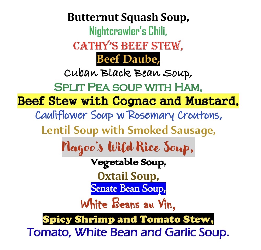 We made and ate more stews and soups than usual this past winter. Actually, I think we had them a couple times a week all season long. Several were old favorites. Others, we made for the first time, and some of those quickly became new favorites. We warmed ourselves with our meals, as much as with the wood stove in the family room. Here’s a list of the assortment we had: