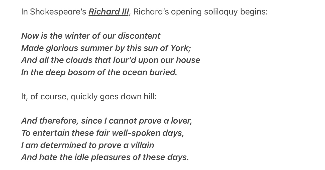 Whether the opening line of Shakespeare’s Richard III, or the title of the 1961 John Steinbeck book, the words “The Winter of our Discontent” aren’t promising. Neither the play, nor the book are particularly cheery. Richard III is of course filled with political and familial intrigue, death and murder, while Steinbeck’s book “The Winter of our Discontent”, examined moral decline in America. Both have more than a little in common with this past winter.