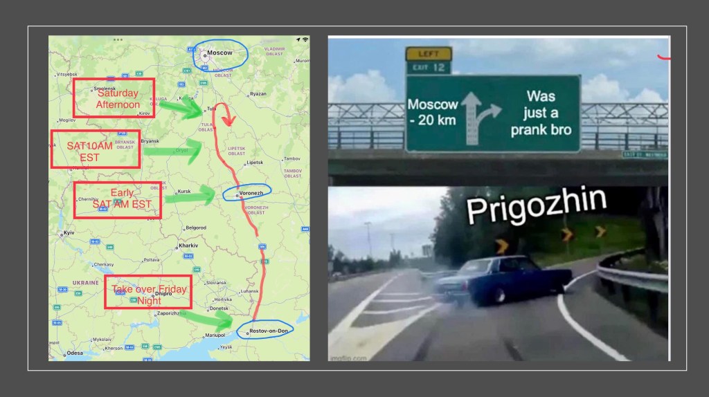 The terms? Maybe, forgiveness for the troops, a safe passage of Prigozhin to Belarus, and no invasion of Moscow itself. Yea, a win-win for everyone – if you believe in fairytales. The “fog of war”, and the cloak around all things “Russia” makes it difficult to assess what is true, what is false, and what is somewhere in between. It will all play out over the next few months. What I know is there is now increased instability in the region, and the world. I’m not a big fan of instability. No sane person should be a fan of instability as we are now experiencing in Russia.
