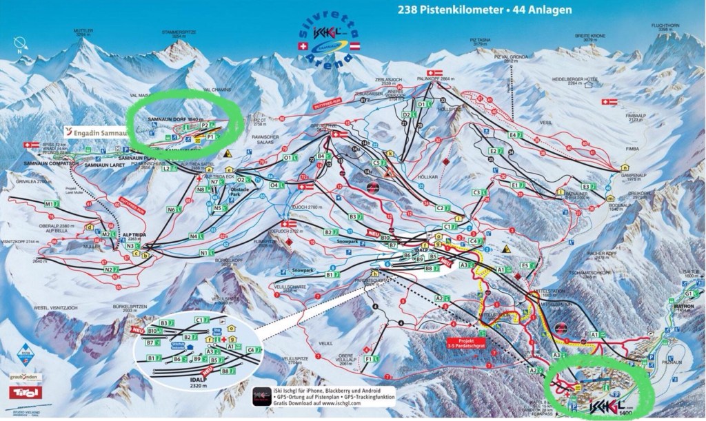 We learned we could ski from Ischgl, across the border and into the duty-free town of Samnaun, Switzerland. As the crow flies, about 10 kilometers separate the two towns, but It’s farther when skiing. Looking at the map, the route was a combination of ski lifts and Blue and Red trails. (in Europe, Blue are considered easy and Red are intermediate trails). Although we didn’t need passports to enter Switzerland, we would need them to re-enter Austria. We decided to give it a go the next day and have lunch in Samnaun, before returning to Austria.